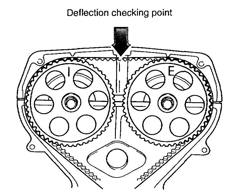 12. Measure timing belt deflection by applying moderate pressure midway between camshaft pulleys. If deflection is not correct, repeat from tensioner installation.
