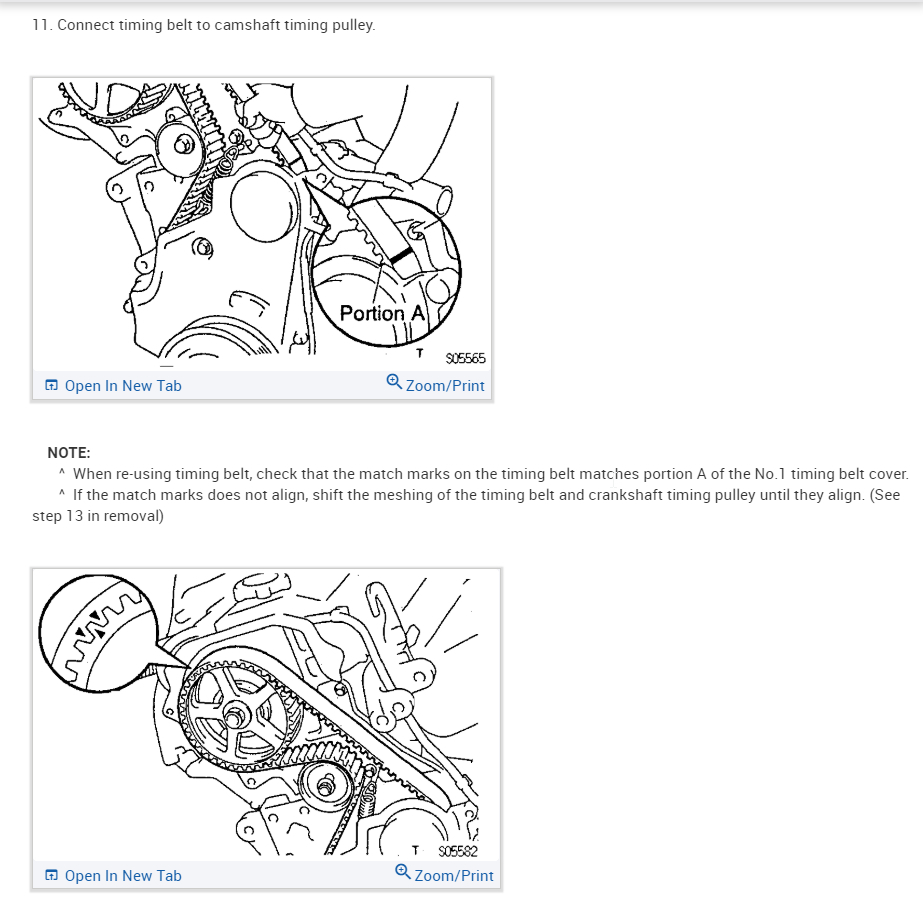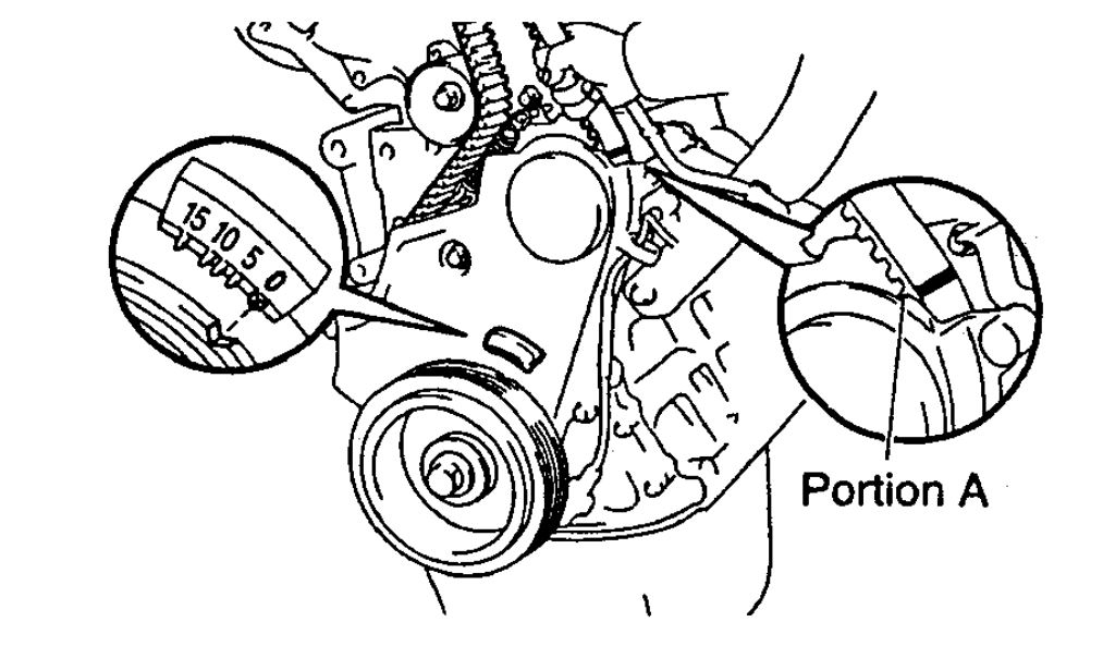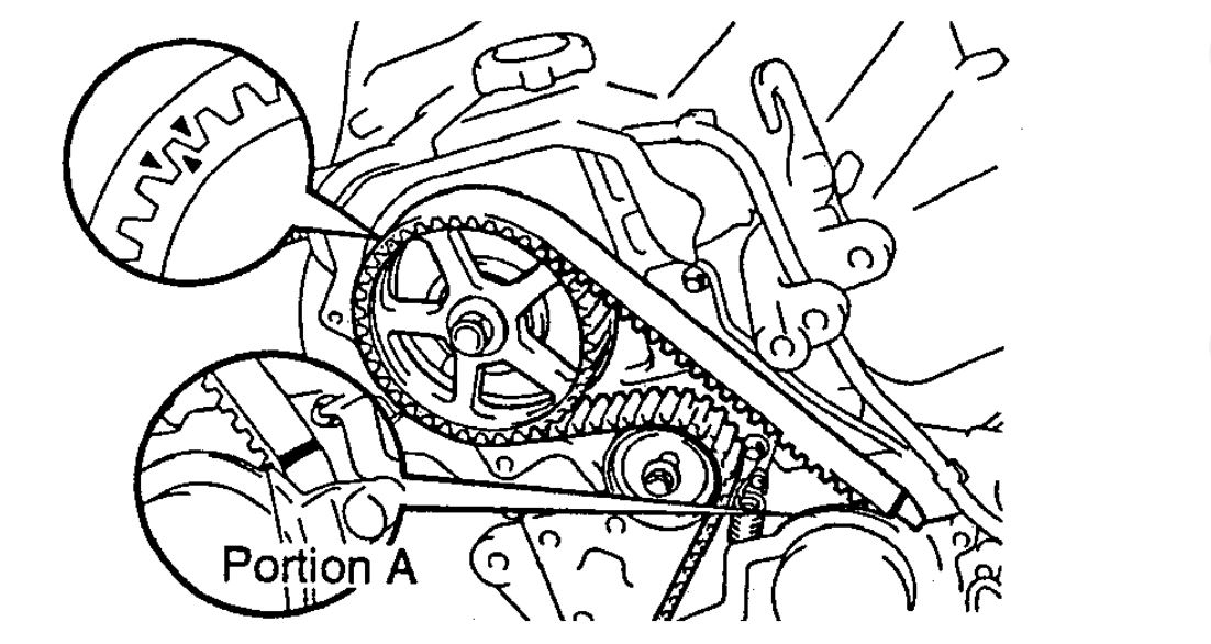 NOTE: When re-using timing belt, place the matchmarks on the timing belt and camshaft timing pulley, and place match marks on timing belt to match portion A of the No.1 timing belt cover.
