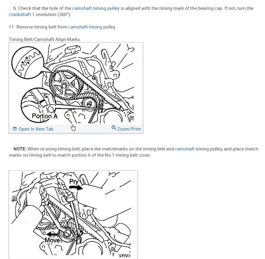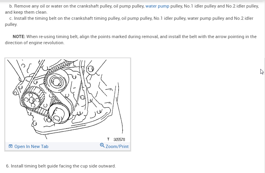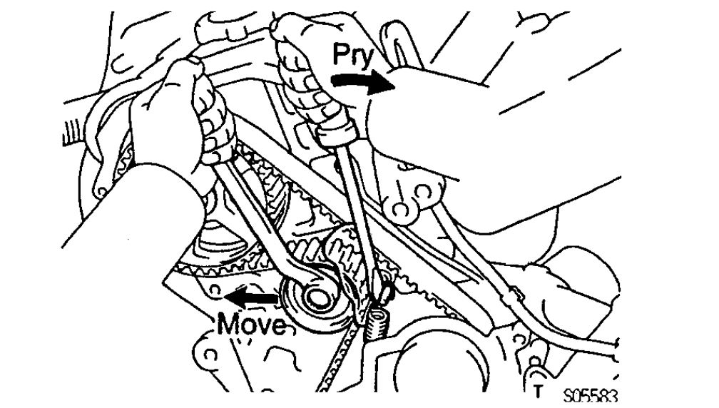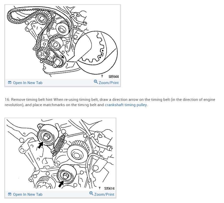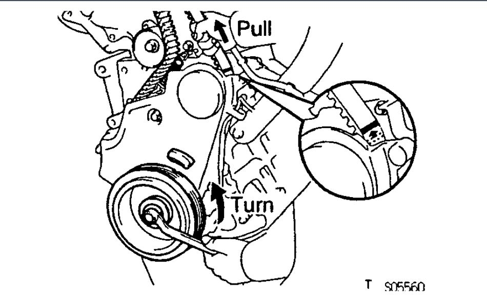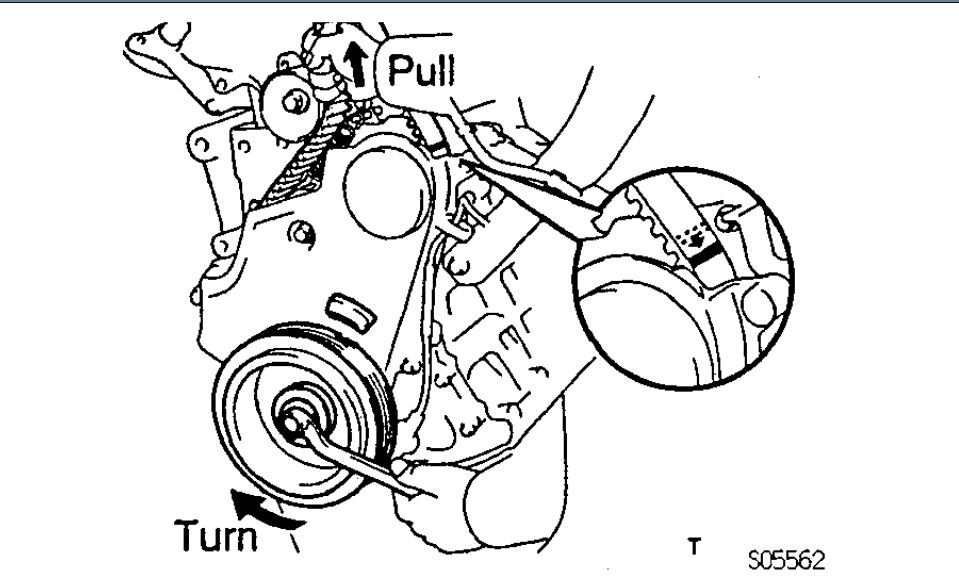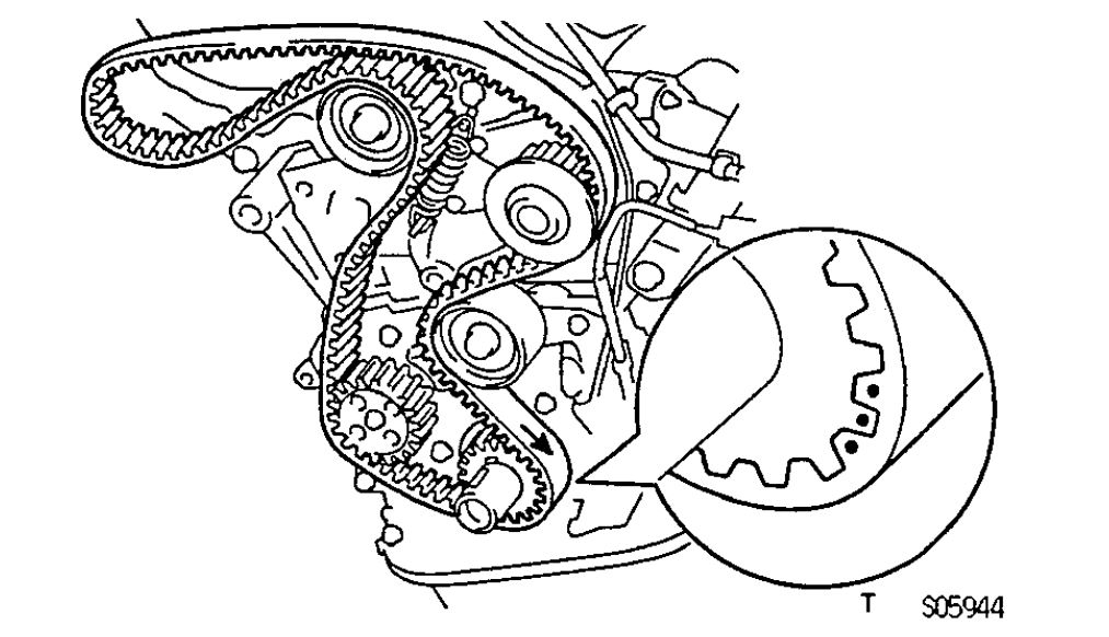 16. Remove timing belt hint When re-using timing belt, draw a direction arrow on the timing belt (in the direction of engine revolution), and place matchmarks on the timing belt and crankshaft timing pulley.