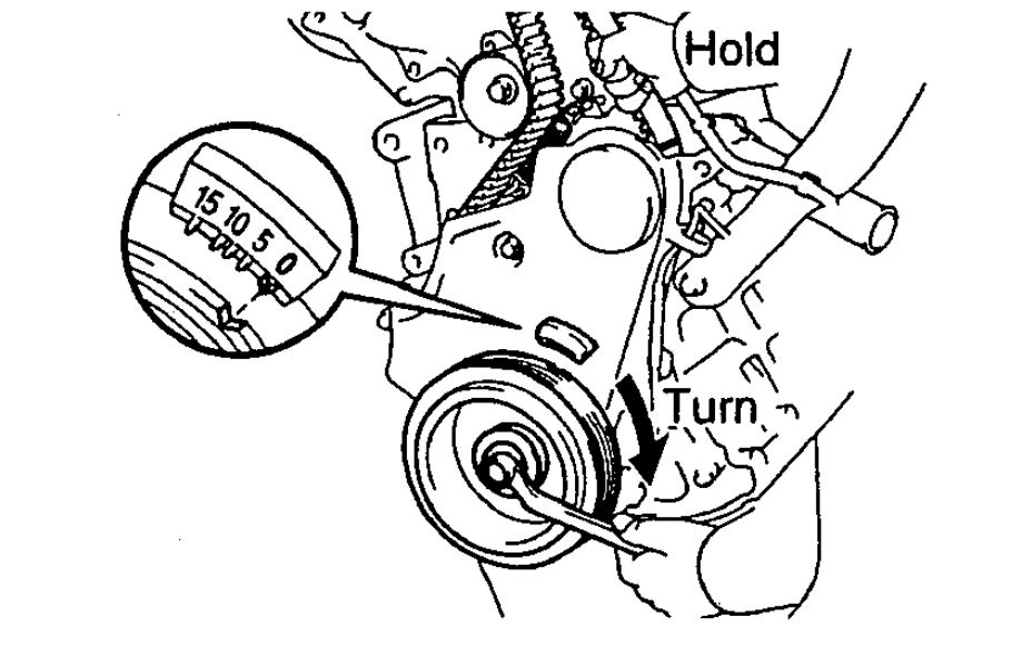 ^ After aligning the match marks, hold the timing belt. And turn the crankshaft pulley counterclockwise, and align its groove with timing mark "O" of the No.1 timing belt cover.