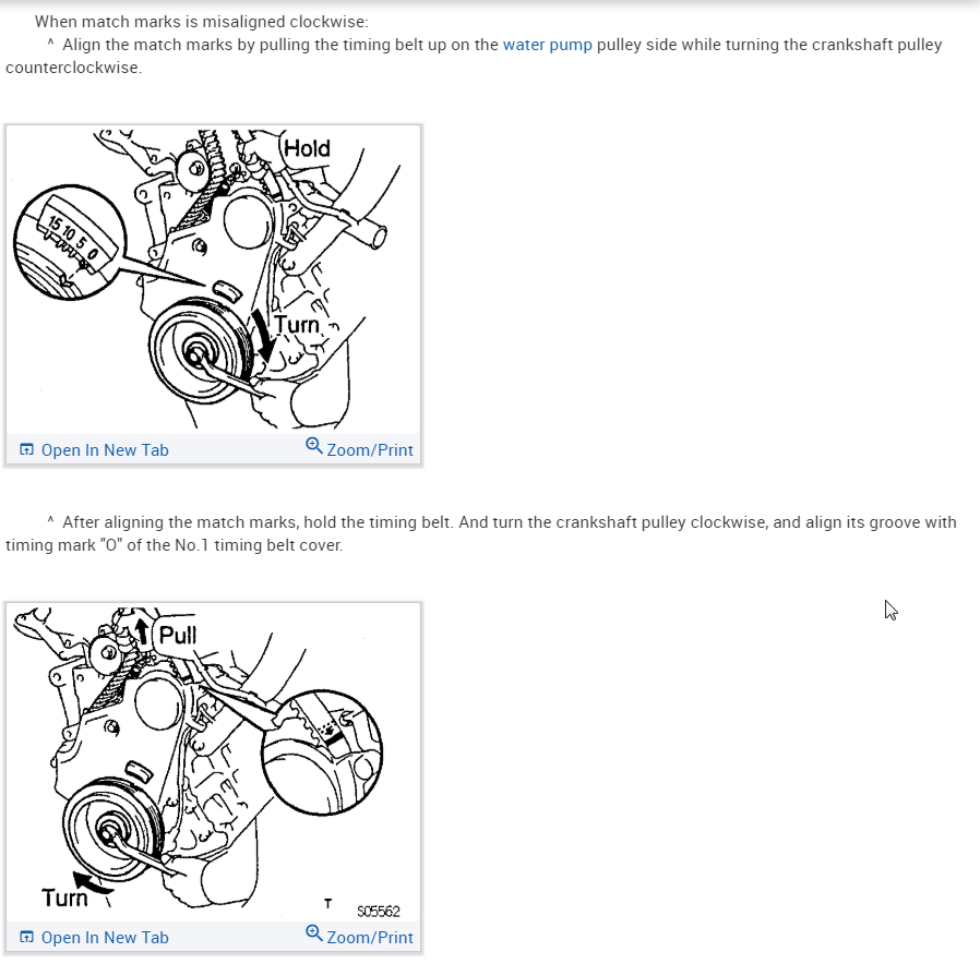 ^ Align the match marks by pulling the timing belt up on the water pump pulley side while turning the crankshaft pulley counterclockwise.
