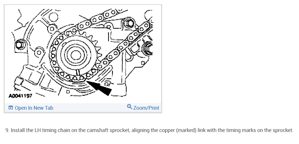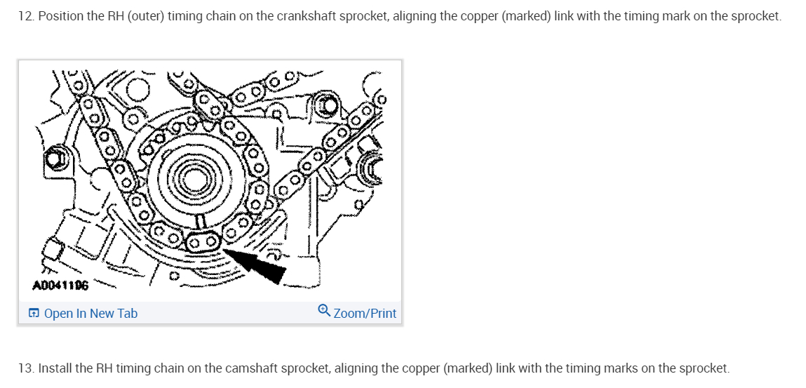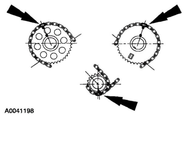 Position the RH timing chain on the camshaft sprocket. Make sure the camshaft sprocket timing mark is positioned between the two copper (marked) chain links.