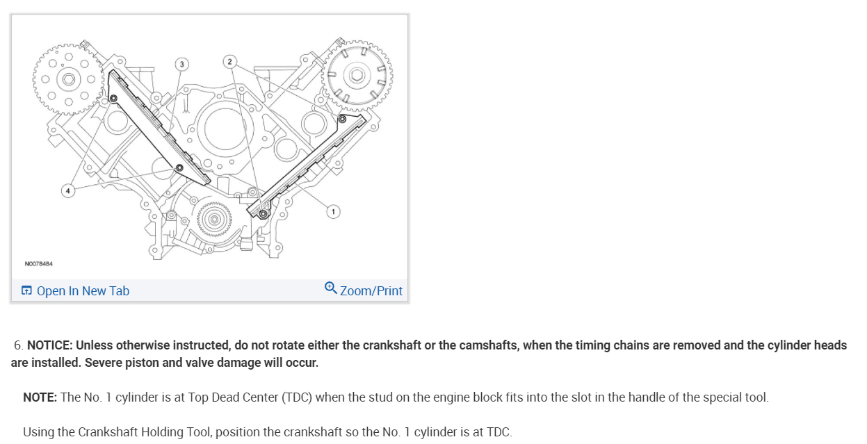 CAUTION:Unless otherwise instructed, at no time when the timing chains are removed and the cylinder heads are installed is the crankshaft or camshaft to be rotated. Severe piston and valve damage will occur.