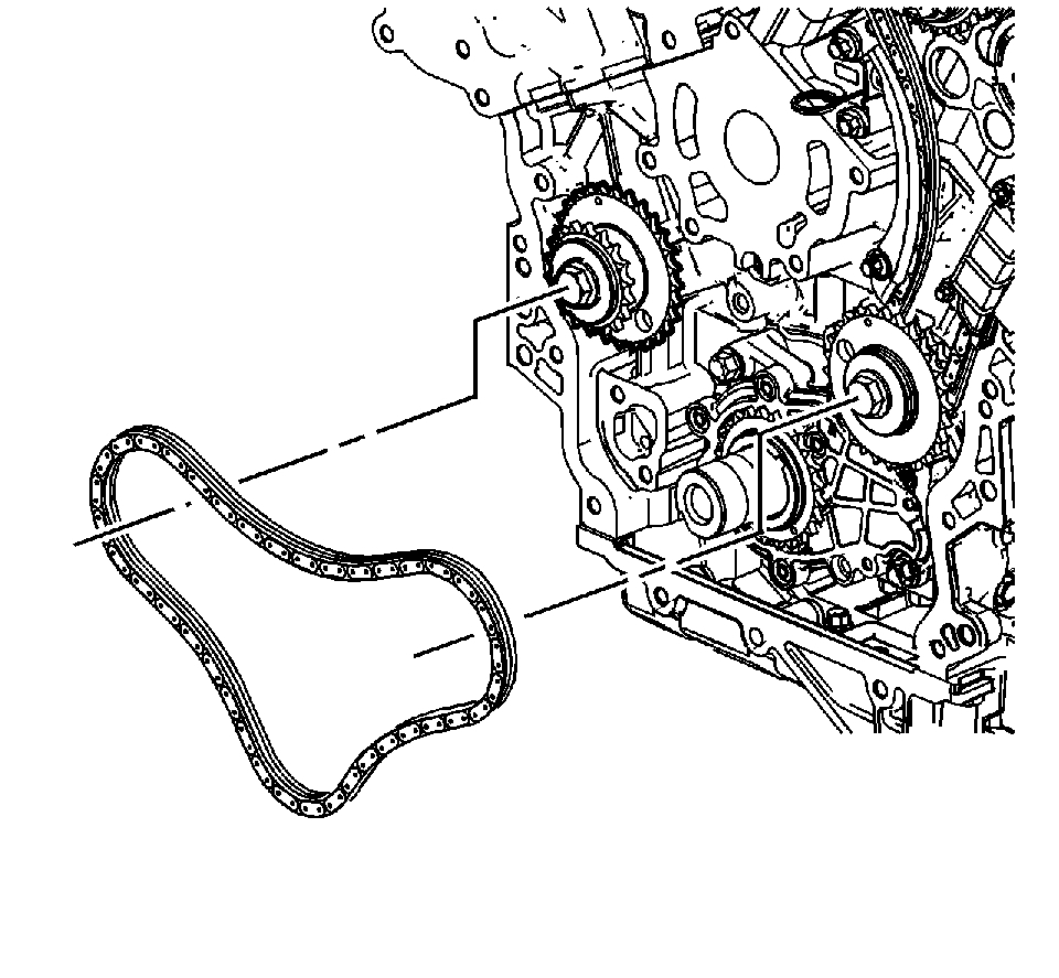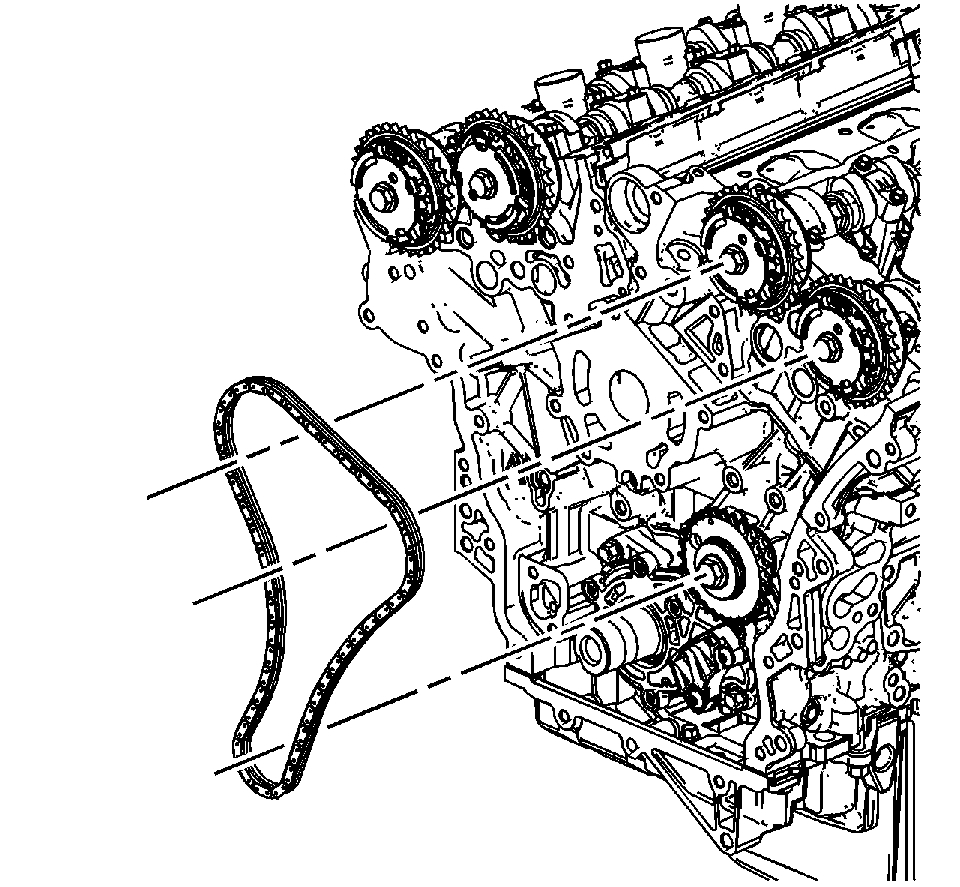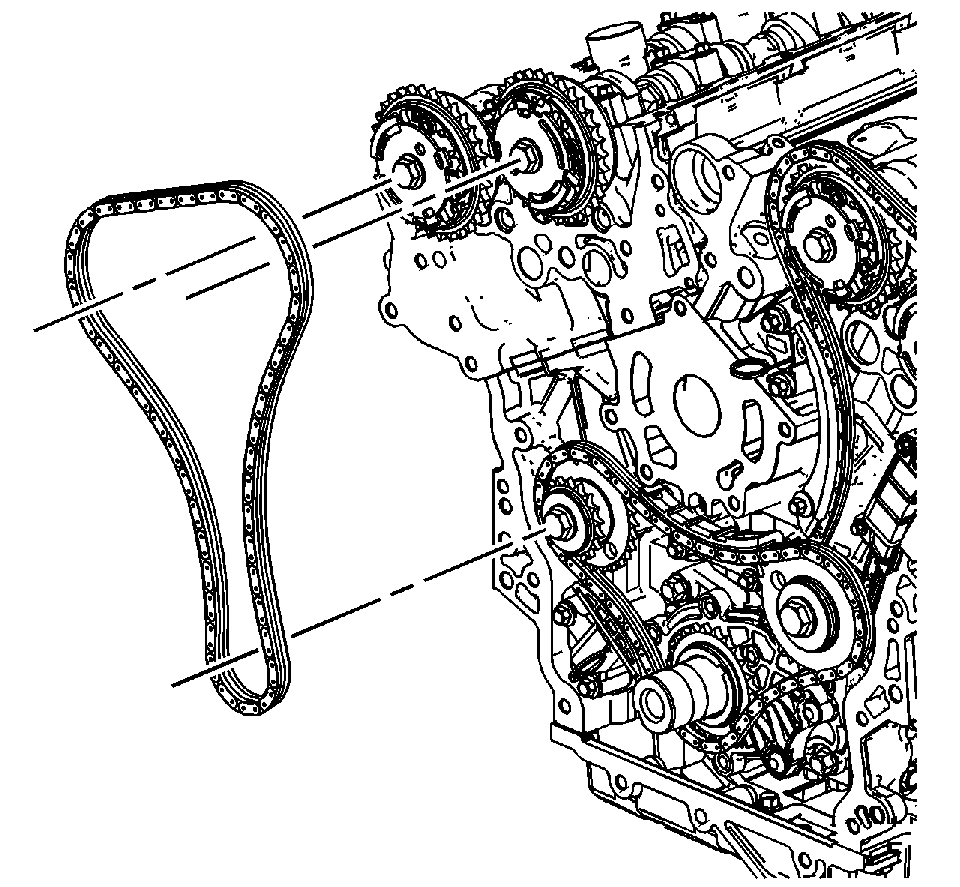 1. Install the primary camshaft timing chain. See: Engine > Overhaul > 121. Primary Camshaft Intermediate Drive Chain Installation