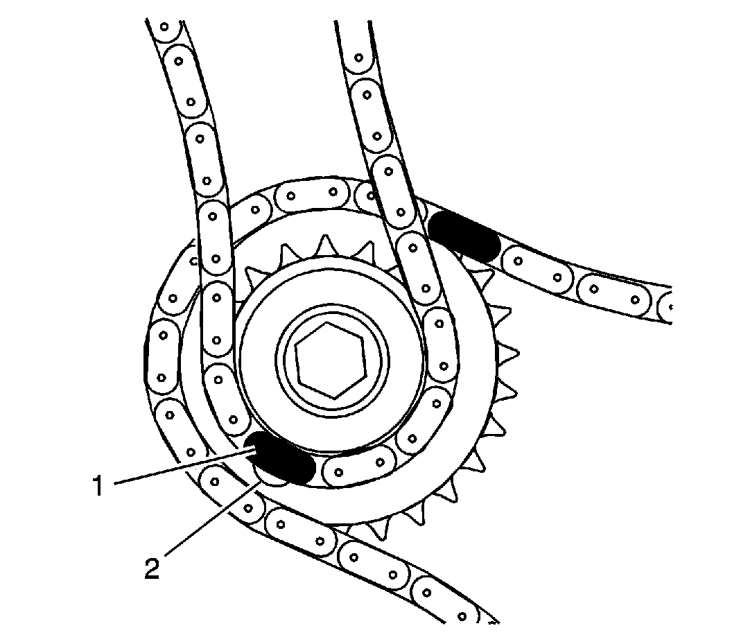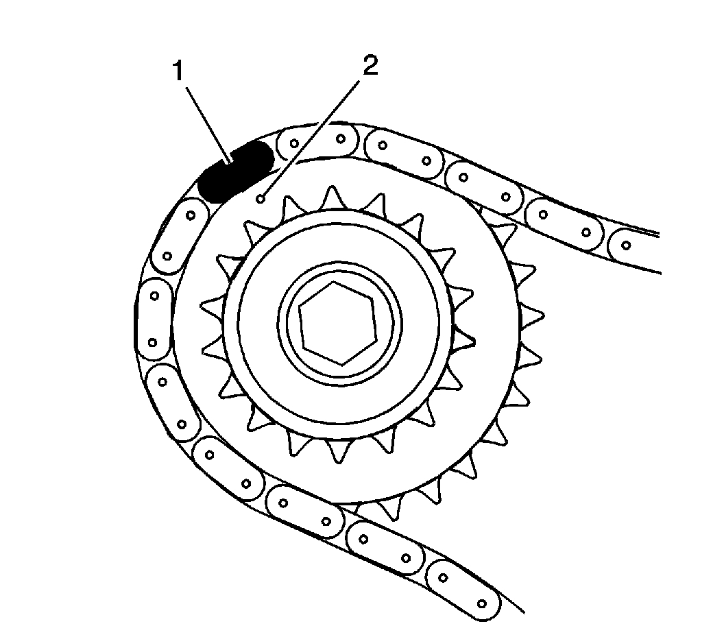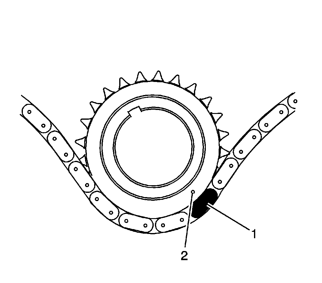 5. The crankshaft sprocket timing mark (2) will align with a timing camshaft drive chain link (1).