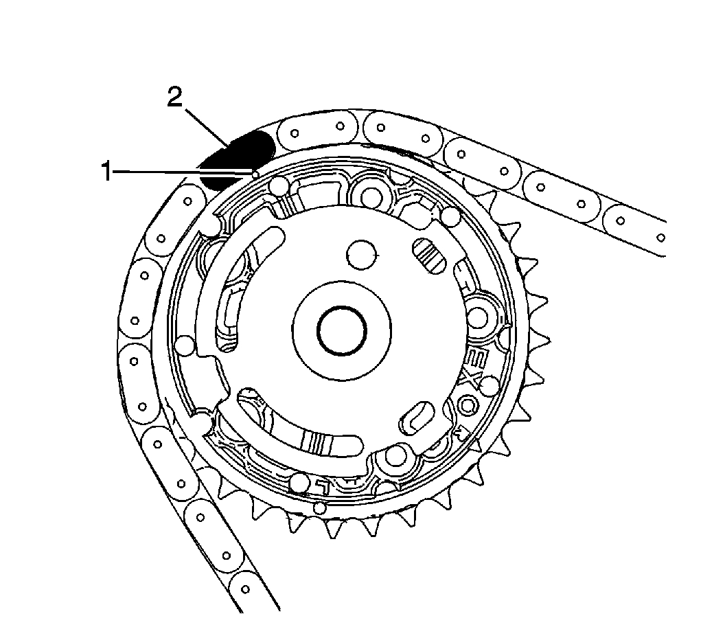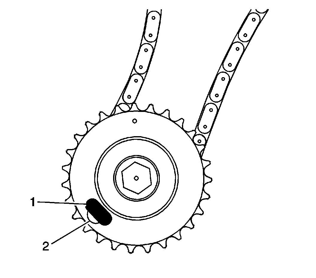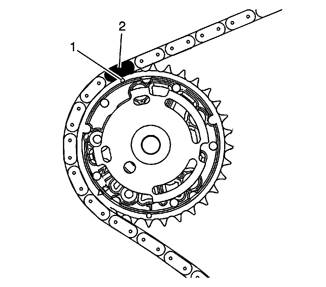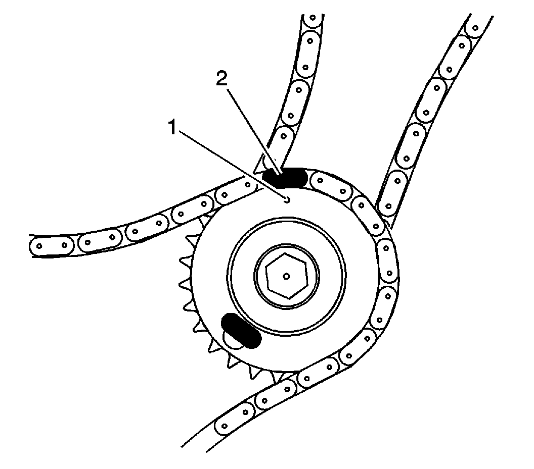 5. The crankshaft sprocket timing mark (2) will align with a timing camshaft drive chain link (1).