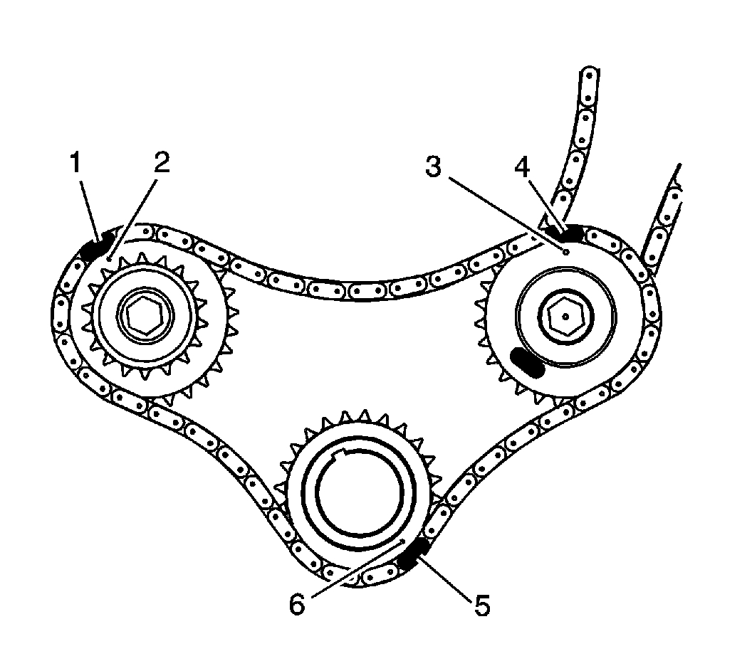 6. Ensure all the timing marks (2, 3, 6) are properly aligned with the timing camshaft drive chain links (1, 4, 5).