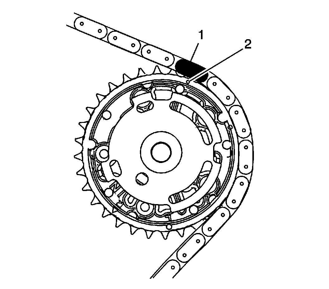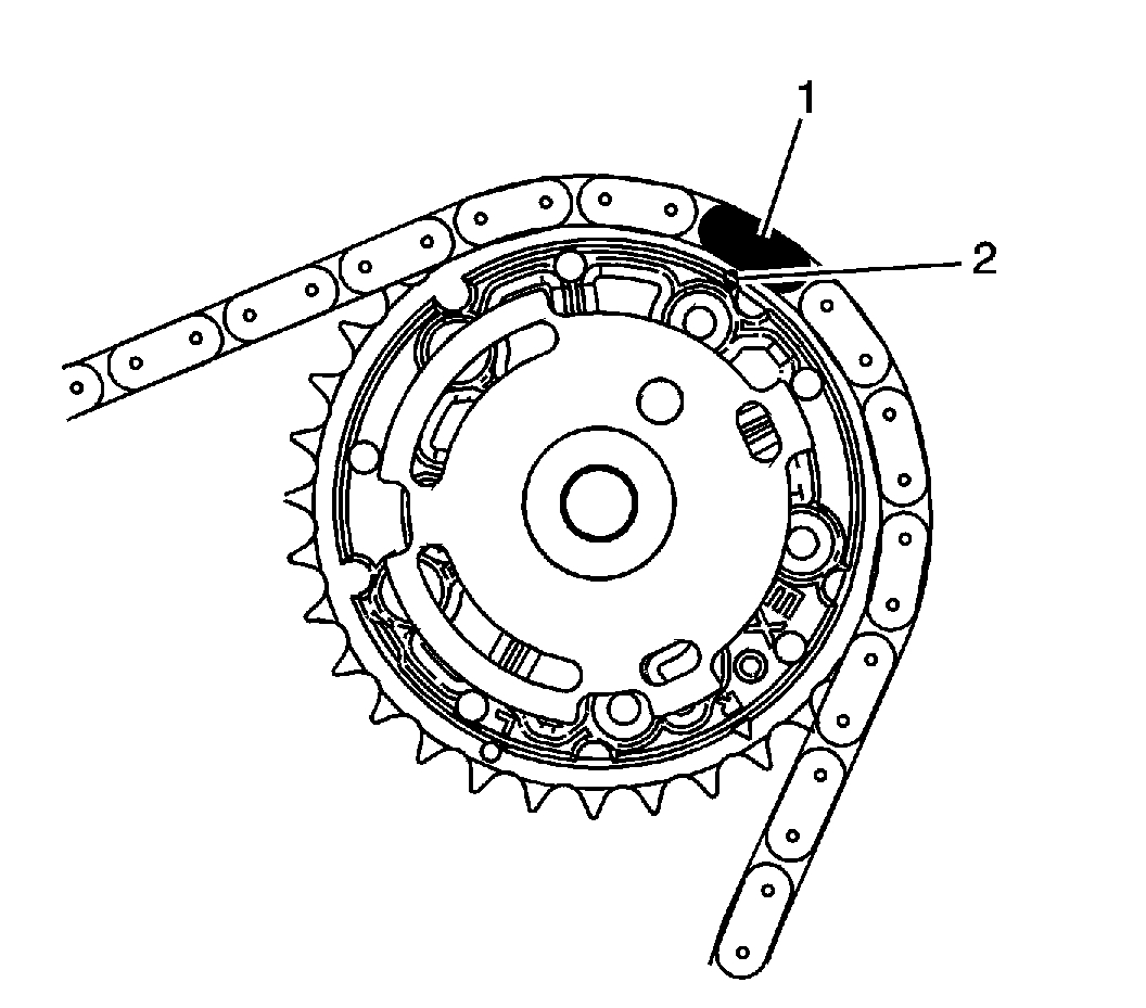 3. The left camshaft intermediate drive chain idler timing mark (1) will align with a timing camshaft drive chain link (2).