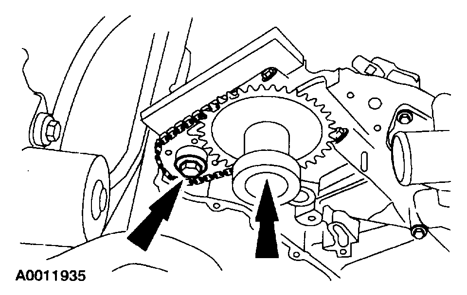 2. NOTE: If the timing mark on the LH timing chain crankshaft gear is facing toward the rear of the engine, install the RH timing chain crankshaft gear with the mark facing forward. If the timing mark on the LH timing chain crankshaft gear is facing toward the front of the engine, install the RH timing chain crankshaft gear with the mark facing toward the rear of the engine.