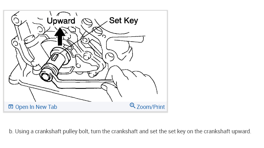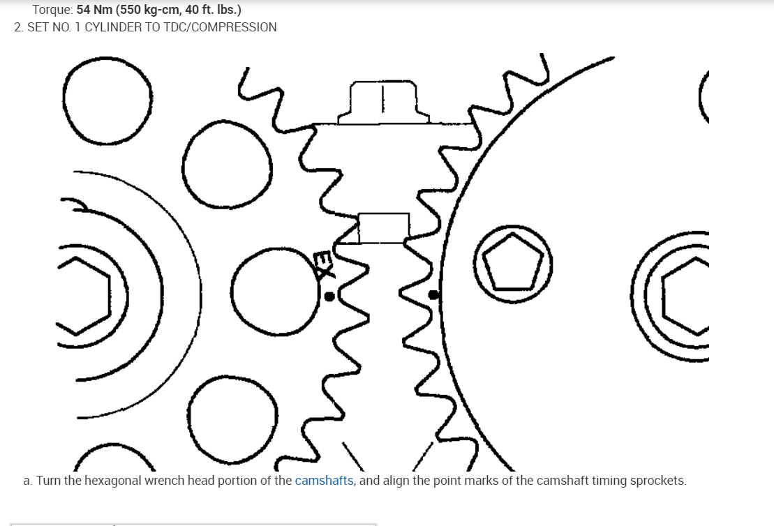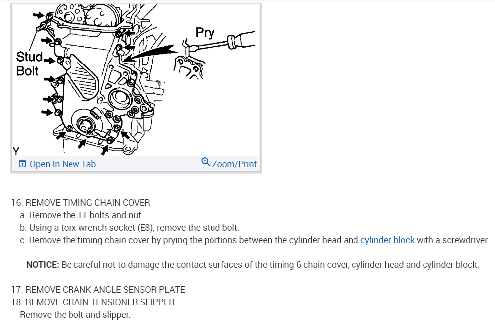 Hello wilsaaw 1ZZ-FE Engines Remove or disconnect the following: Negative battery cable Right engine cover Accessory drive belt and generator Power steering pump, without disconnecting the hoses Right engine mount Cylinder head cover Turn the crankshaft so the No. 1 piston is at TDC on the compression stroke Crankshaft pulley Crankshaft position sensor from the timing chain cover Accessory drive belt tensioner Right engine mounting bracket Chain tensioner Water pump Timing chain cover Crankshaft angle sensor plate Timing chain tensioner slipper Timing chain and crankshaft timing sprocket To install: Crankshaft sprocket with timing chain. Be sure to align the No. 1 mark link with the mark on the sprocket