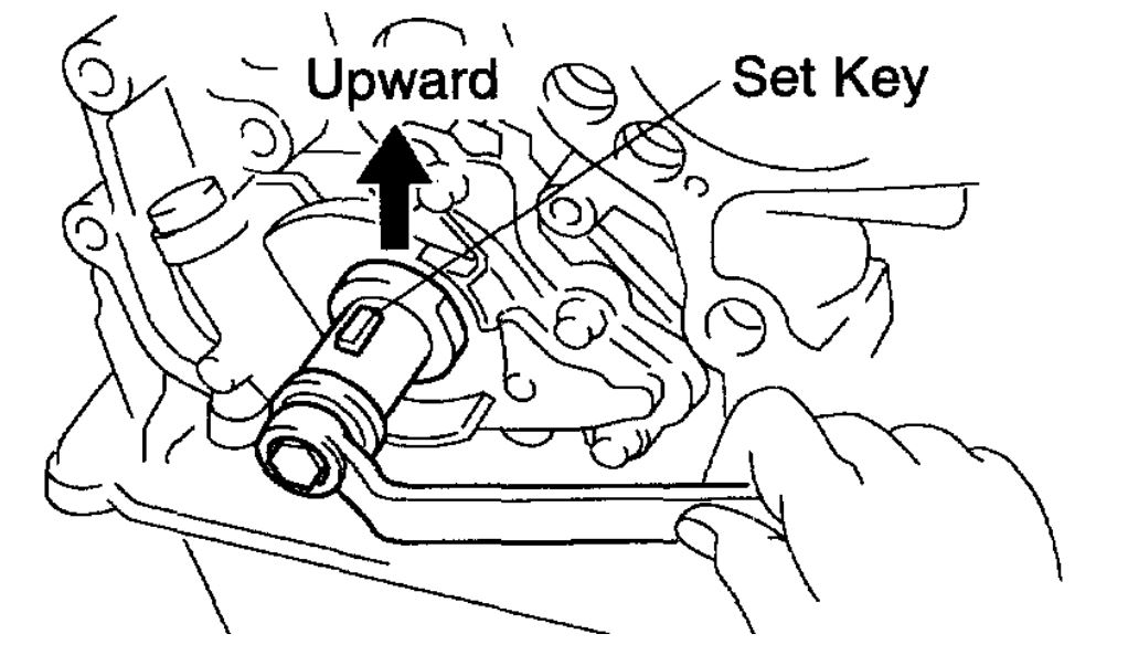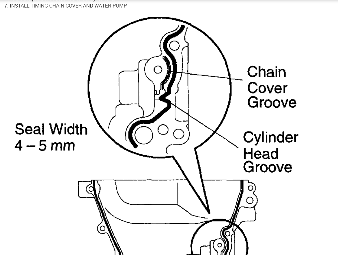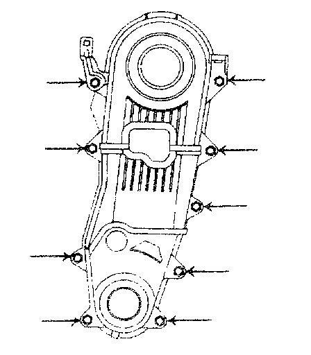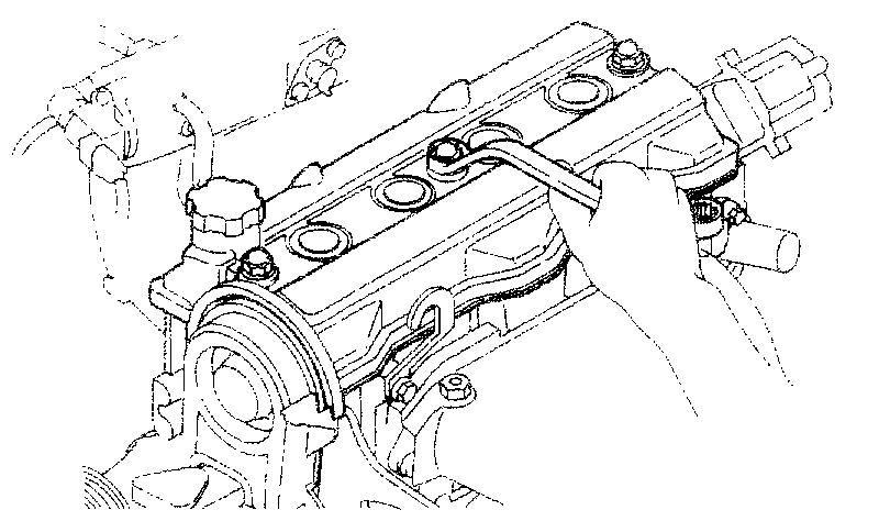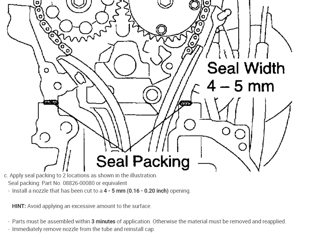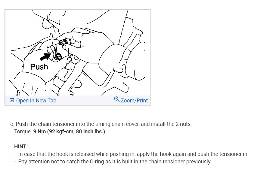 # Install the tensioner, using a new O-ring. Torque the bolts to 80 inch lbs. (9 Nm). # Turn the crankshaft counterclockwise and remove the hook from the pin. Turn the crankshaft clockwise and be sure the slipper is pushed by the plunger. # Check the valve timing by turning the crankshaft clockwise until the mark of the pulley is aligned with the mark on the timing chain cover. The marks on the camshaft sprockets should be facing each other as shown. # Install or connect the following: Silicone sealant to the 2 areas where the timing chain cover meets the cylinder head. Cylinder head cover. Bolts with washers in the sequence shown: 80 inch lbs. (9 Nm). Bolts without washers: 96 inch lbs. (11 Nm). Right engine mount. Bolts: Marked A : 47 ft. lbs. (64 Nm). Marked B : 19 ft. lbs. (26 Nm). Nut: 38 ft. lbs. (52 Nm). Power steering pump Alternator and drive belt Right engine undercover Negative battery cable Washer tank # Fill the cooling system to the proper level. # Start the vehicle, check for leaks and repair if necessary. hope this help.