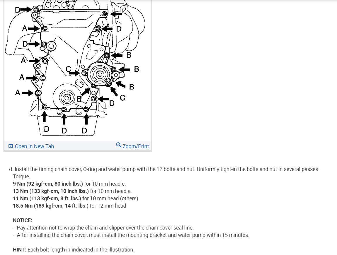 Chain tensioner slipper. Bolt: 14 ft. lbs. (18.5 Nm). Crankshaft angle sensor plate New seal in the front cover Silicone sealant to the timing chain cover as illustrated Timing chain cover Water pump. Tighten the bolts marked -C- to 80 inch lbs. (9 Nm) and tighten the remaining bolts to 14 ft. lbs. (18.5 Nm). Be sure to install the bolts in their original locations. Bolt lengths: 1. A: 1.77 in. (45mm) 2. B: 1.38 in. (35mm) 3. C: 1.18 in. (30mm) 4. D: 0.98 in. (25mm)