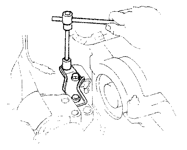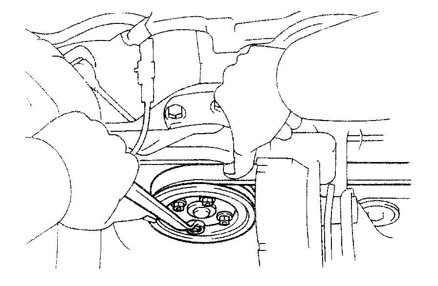 Install or connect the following: Right engine mounting bracket. Bolts, with sealant applied: 35 ft. lbs. (47 Nm). Drive belt tensioner. Bolt: 51 ft. lbs. (69 Nm). Nut: 21 ft. lbs. (29 Nm). Crankshaft position sensor. Tighten to 80 inch lbs. (9 Nm). Crankshaft pulley. Bolt: 102 ft. lbs. (138 Nm). Release the ratchet pawl and compress the chain tensioner. Place the hook on the pin to keep the tensioner compressed.