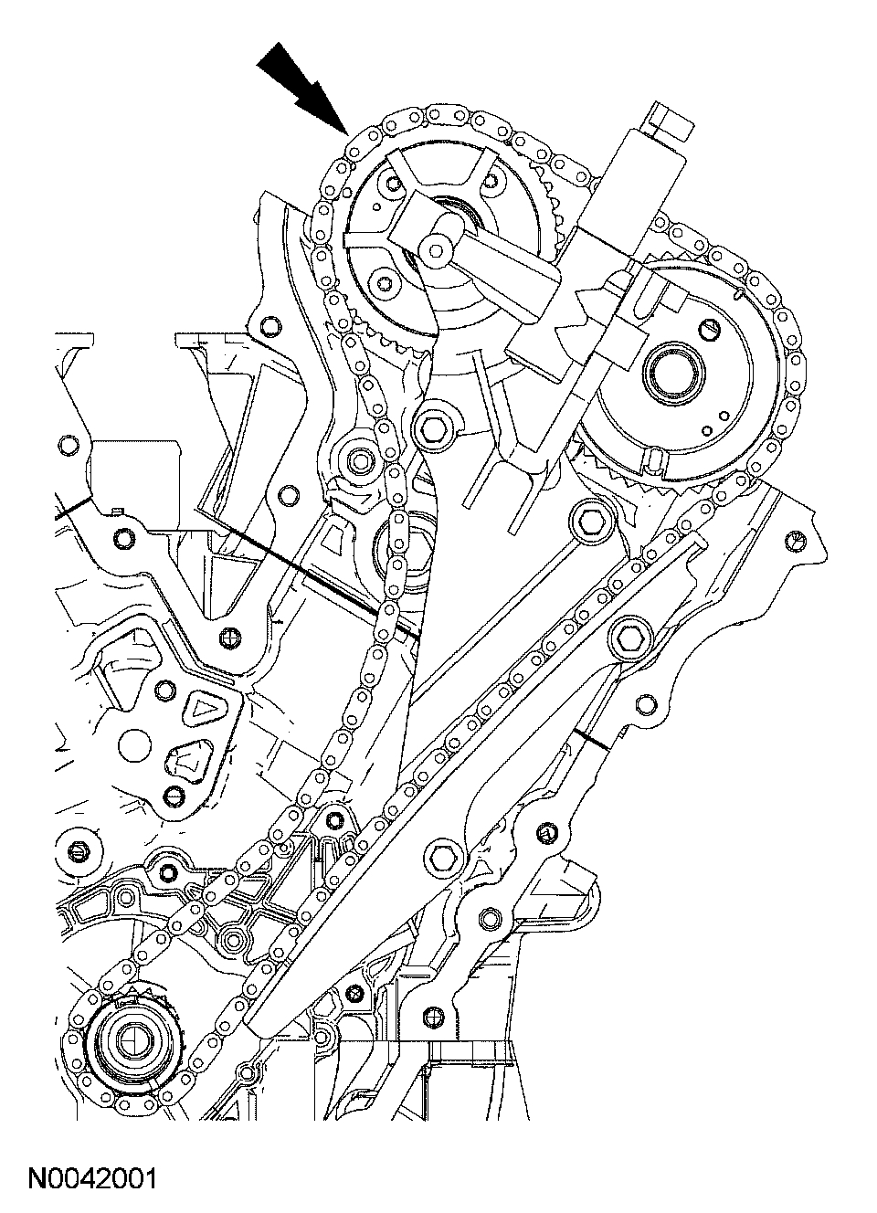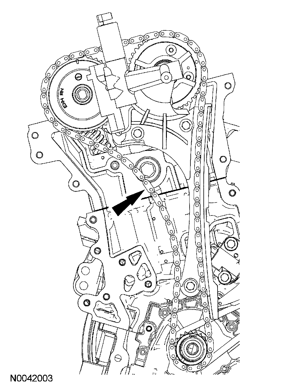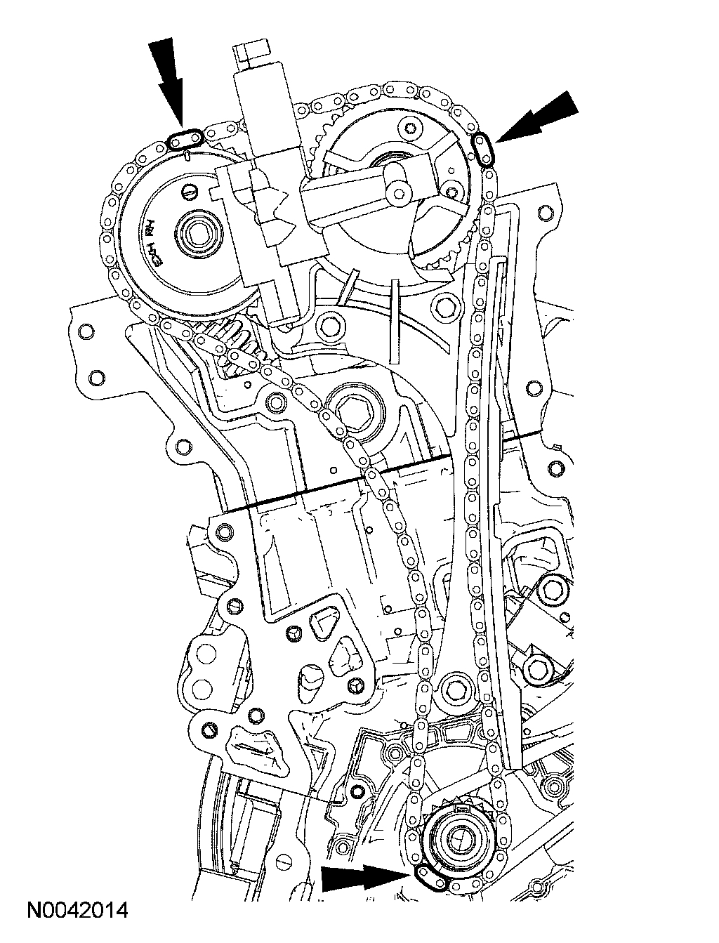 6. If timing marks in the timing chains are not evident, use a permanent-type marker to mark the crankshaft and camshaft timing marks on the LH and RH timing chains.
