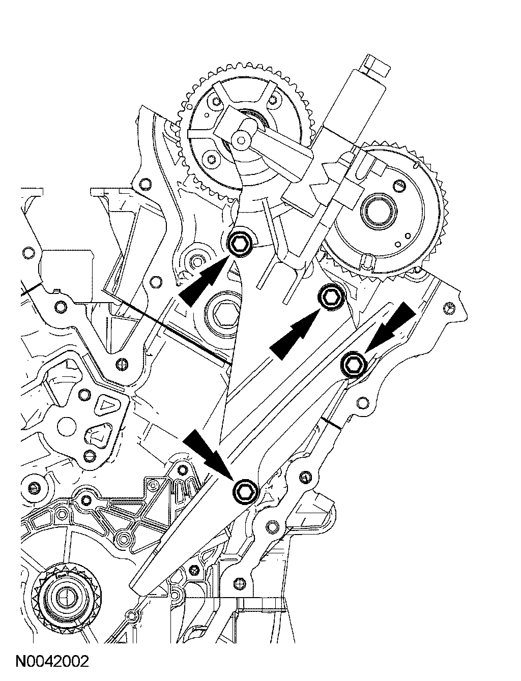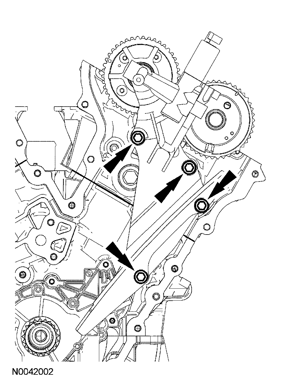 13. Remove the LH timing chain tensioner and tensioner arm.