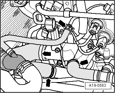 - Disconnect coolant hoses at positions indicated by - arrows -.