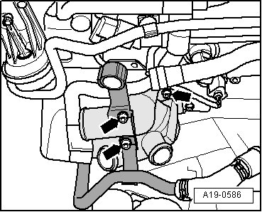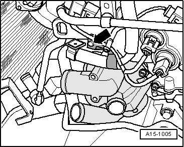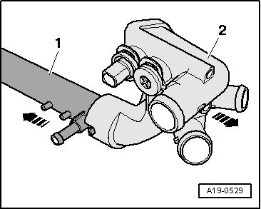 - Remove coolant thermostat housing - 2 - while pressing coolant pipe - 1 - toward coolant pump with pry bar.