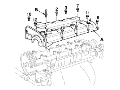 (4)Loosen the cylinder head cover bolts(B) and then remove the cover(A) and gasket.