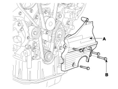 11. Install the timing belt lower cover(A) with 5bolts(B).