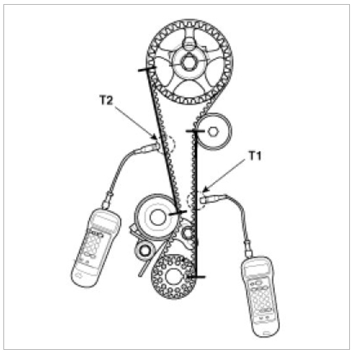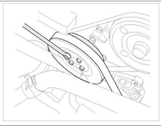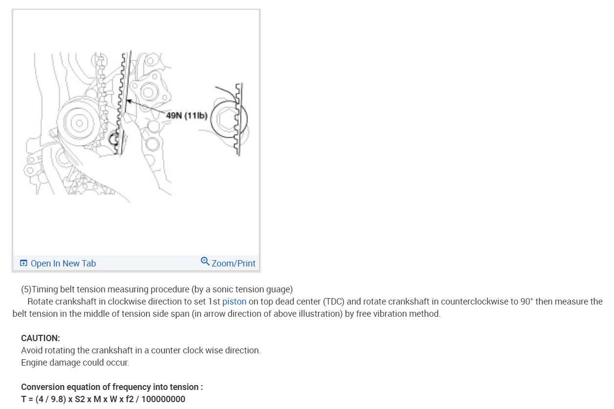 Rotate crankshaft in clockwise direction to set 1st piston on top dead center (TDC) and rotate crankshaft in counterclockwise to 90°then measure the belt tension in the middle of tension side span (in both arrow direction of above illustration ) by free vibration method.