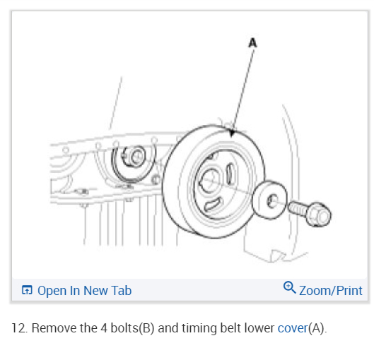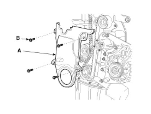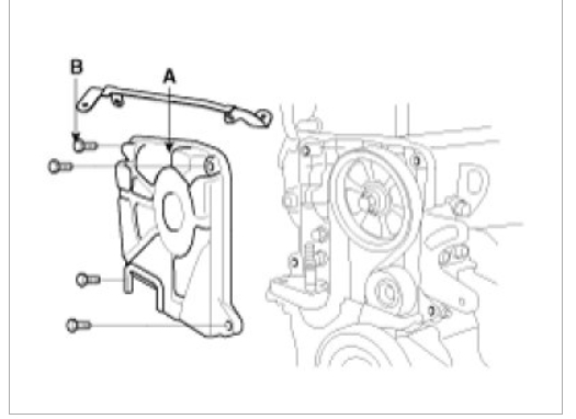 Install the timing belt lower cover(A) with 5bolts(B).