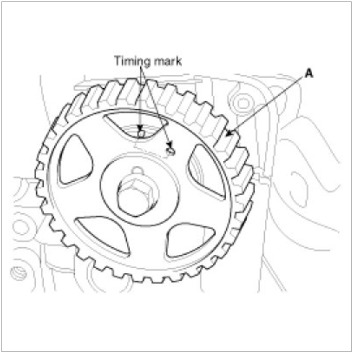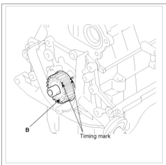Align the timing marks of the camshaft sprocket(A) and crankshaft sprocket(B) with the No.1 piston placed at top dead center and its compression stroke.