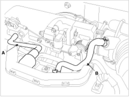 (3) Install the PCV(Positive Crankcase Ventilation) hose(A) and breather hose(B) to the cylinder head cover.