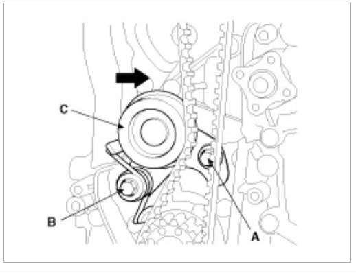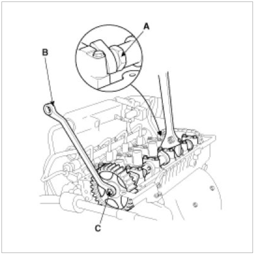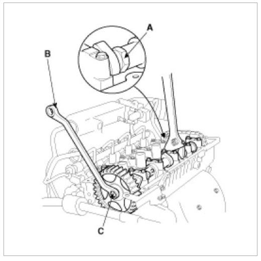 (1) Hold the portion(A) of the camshaft with a hexagonal wrench, and remove the bolt(C) with a wrench(B) and remove the camshaft sprocket.
