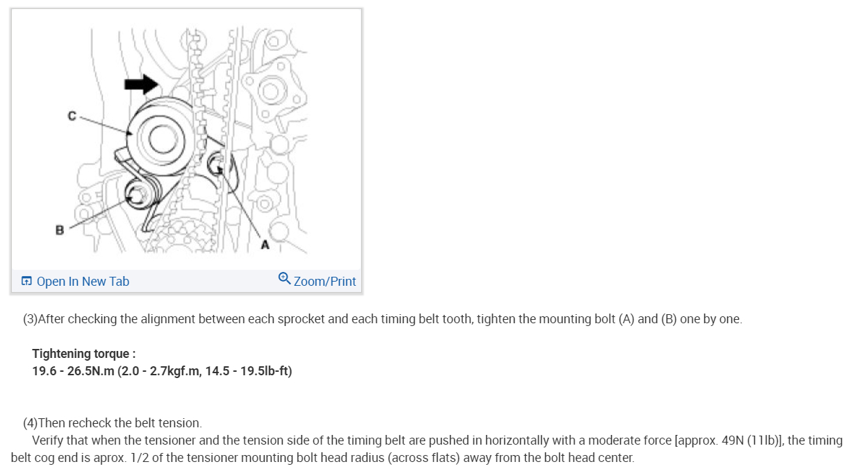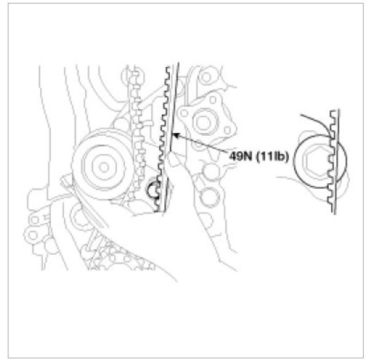 Verify that when the tensioner and the tension side of the timing belt are pushed in horizontally with a moderate force [approx. 49N (11lb)], the timing belt cog end is aprox. 1/2 of the tensioner mounting bolt head radius (across flats) away from the bolt head center.