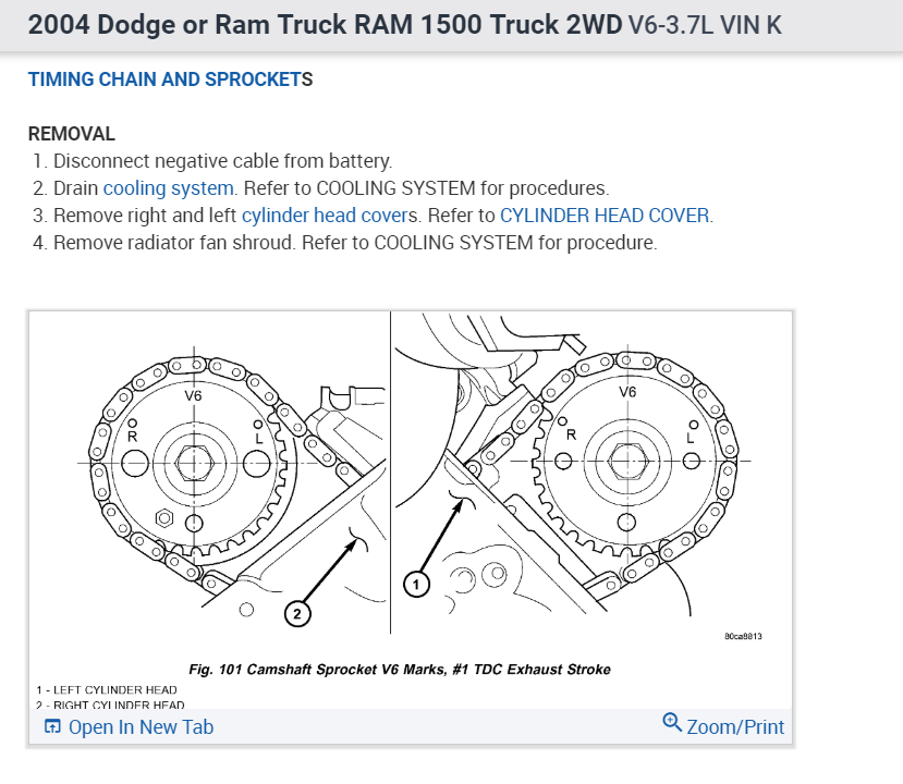 I'm looking for the timing chain routing diagram for a 2004 Dodge Ram 1500 3.7L standard transmission 4x2. I replaced the passenger side cylinder head on the truck. before I pulled the cam sprocket and timing chain on the passenger side only. Since the vehicle has three chains I set the crank on TDC, but I would like to see a diagram first just in case them eyeballs of mine were off a hair.