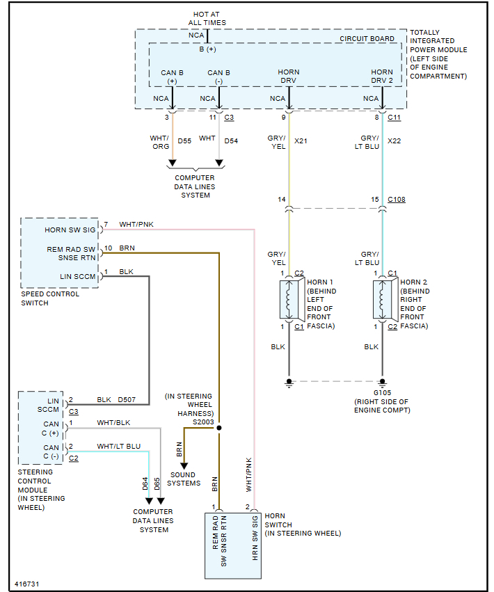 Hi, there! I'm having an issue with my TIPM where the horn is randomly sounding. I've already narrowed it down to being the TIPM. I have pulled the TIPM and looked at all connections inside and outside, all seem to be fine. I'd love it if I could get a wiring diagram to know which wires affect the horn to narrow down exactly where I should be looking for damaged wires/connections.