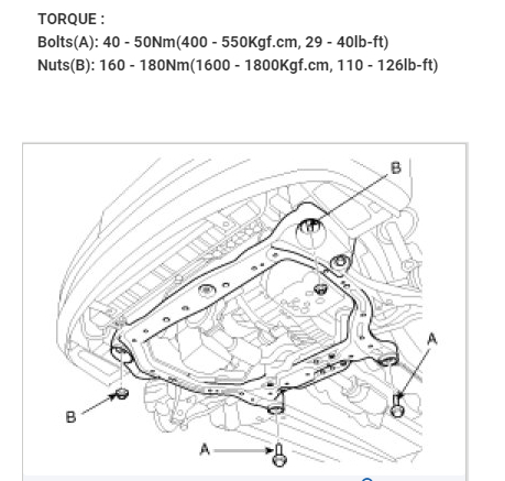 If you look below, I attached the torque specs for the sub frame bolts and nuts. Let me know if this is what you needed.