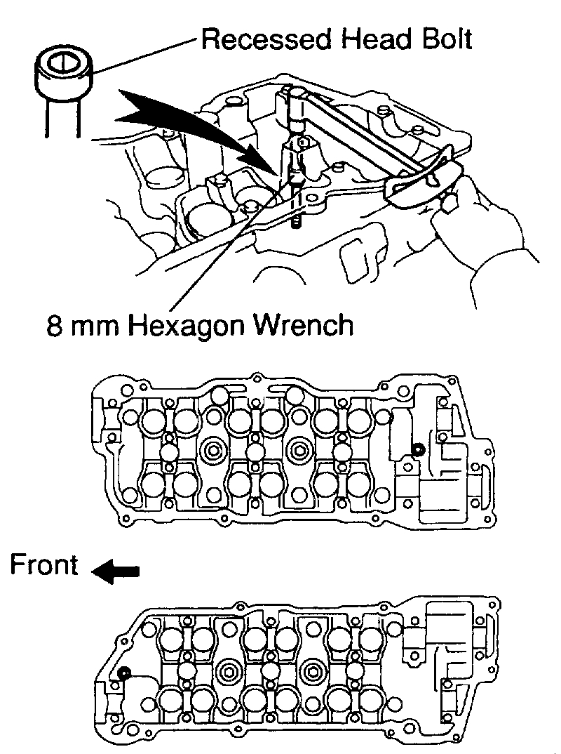 b) Using an 8 mm hexagon wrench, install the cylinder head bolt on each cylinder head, then repeat for the other side, as shown.