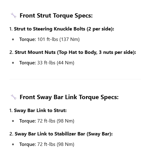 Torque specs for Front Struts and Sway bar links needed?