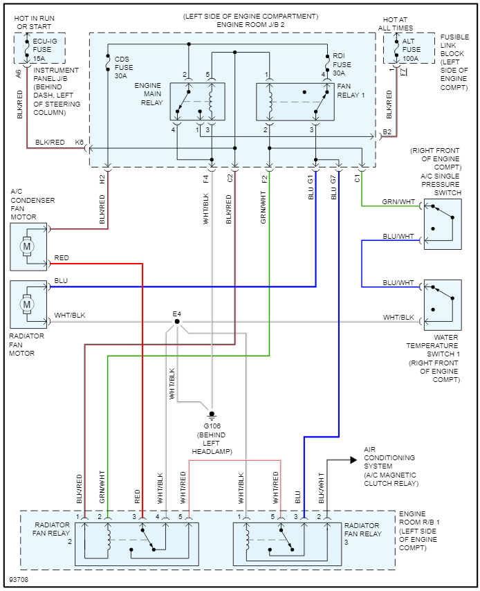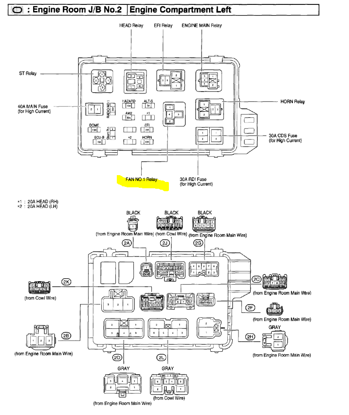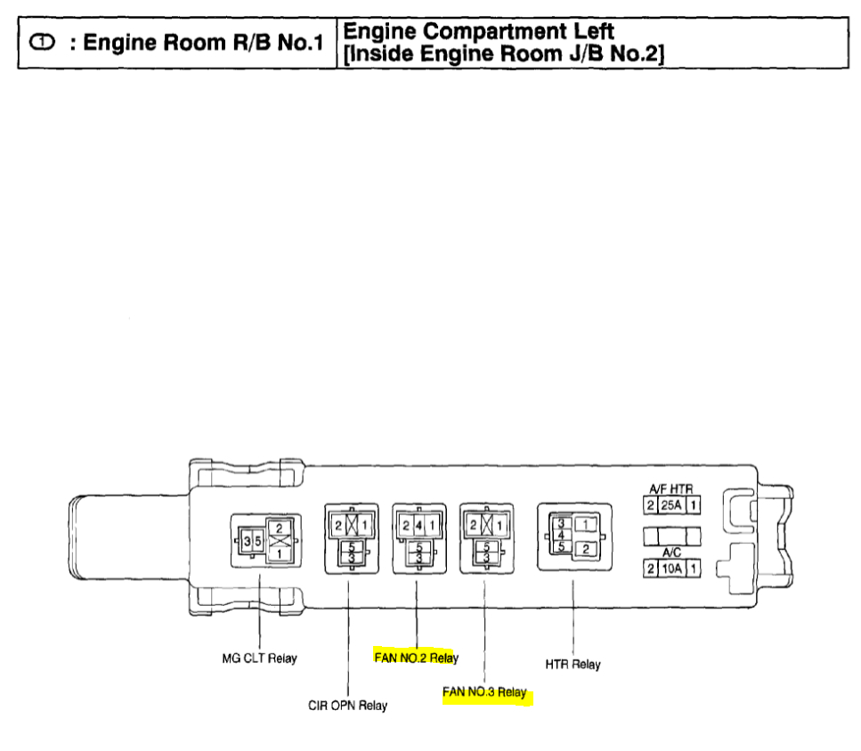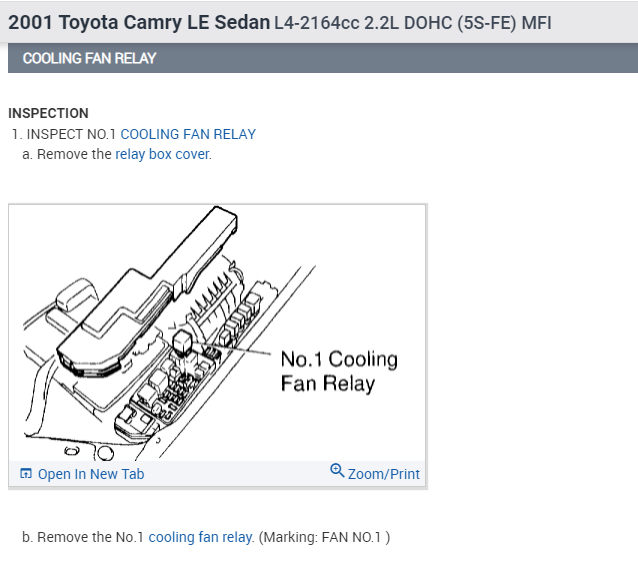 First check the relay. This vehicle has 3 relays for the cooling fan. They are located in the under-hood fuse box.