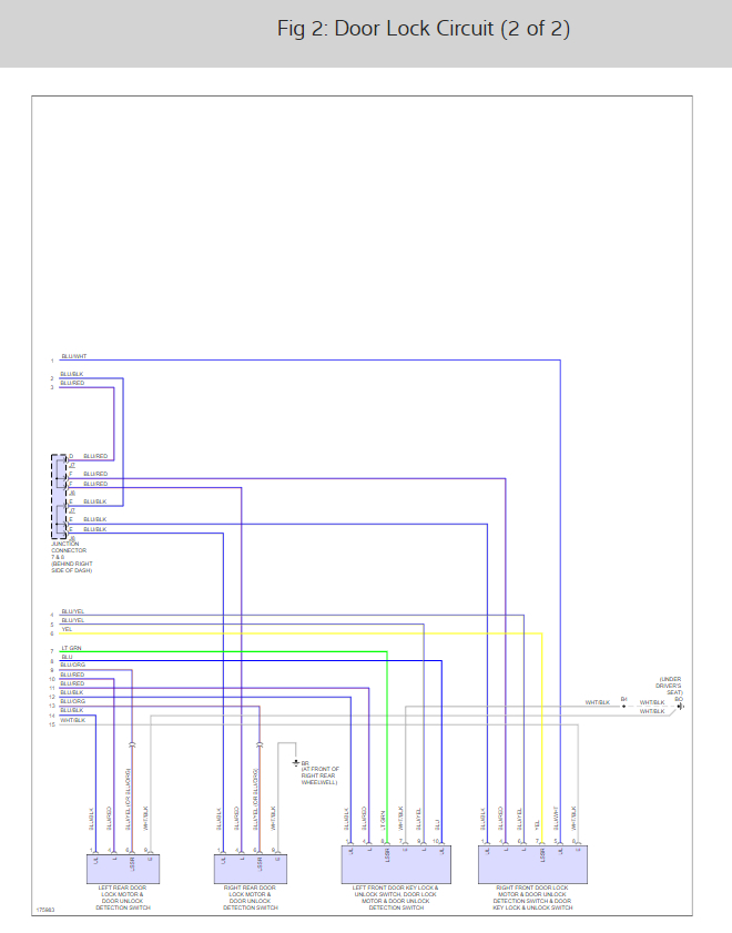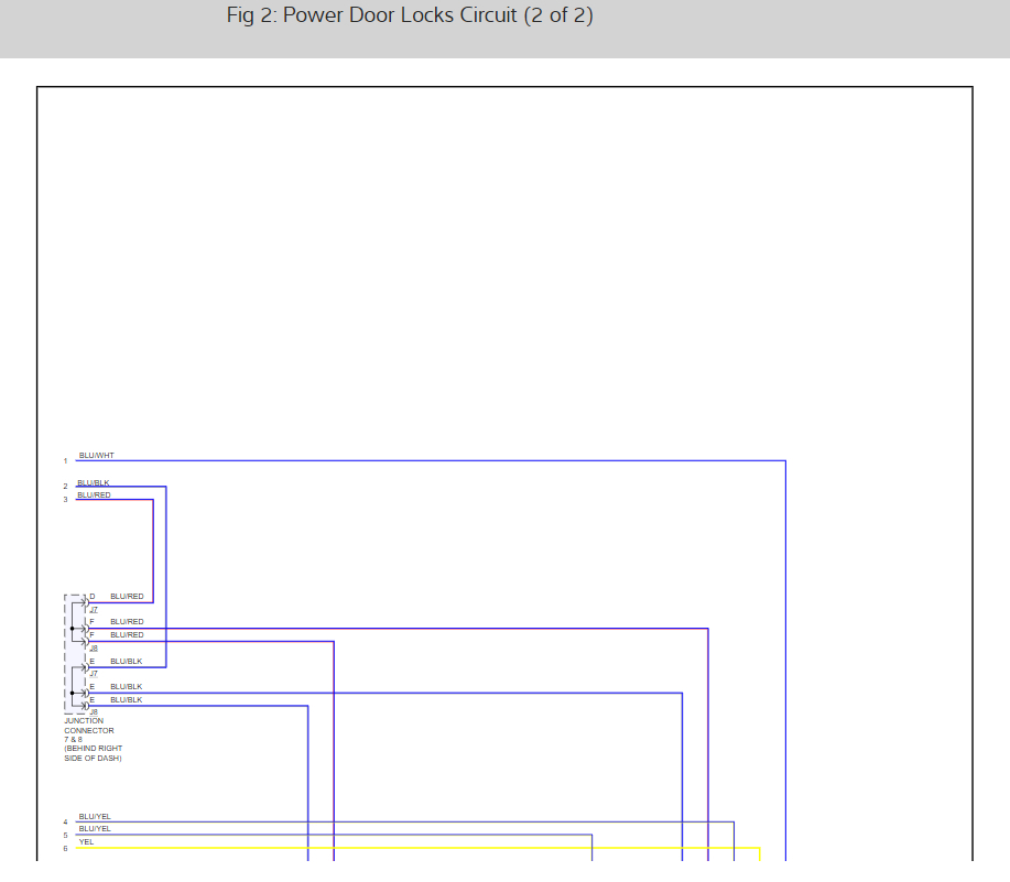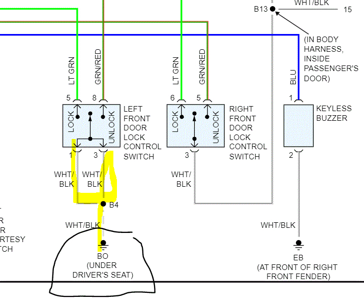 Next, see if there is power being sent to the switch via the wires highlighted. If there is power, then the ground, which has a splice in it, needs checked. Note that the ground is for both lock and unlock, but two wires go to one ground. They are spliced together. There is a chance that the unlock ground has failed but the lock ground is still good. (pic 2)