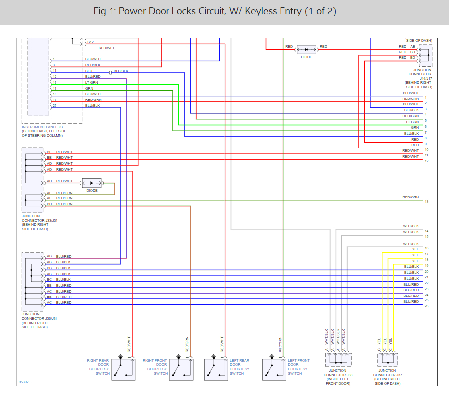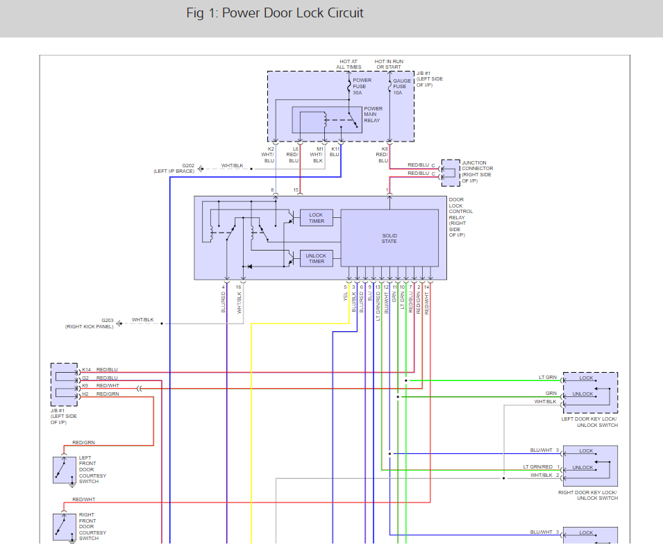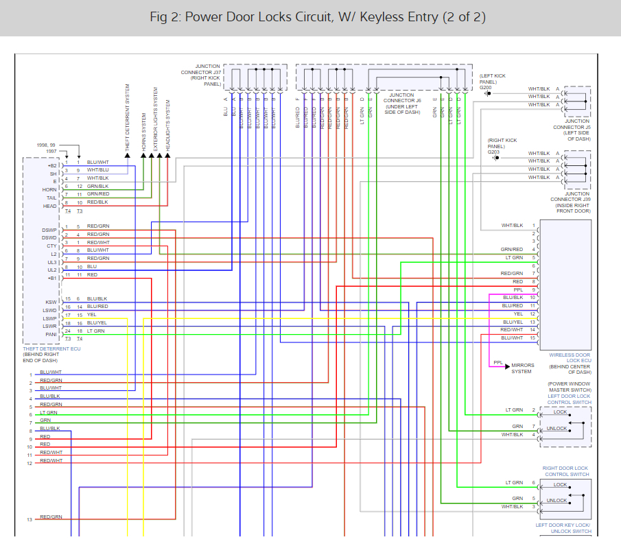 I have attached a few pics below of the wiring schematics. The first three pertain to the windows. Picture 4 shows power for the locks. Since none of them are working, the first thing you need to confirm is there is power from the circuit breakers. For the windows, you need to check for power to the blue wire and the white/black wire. As far as the locks, the white/light blue wire should always have power.