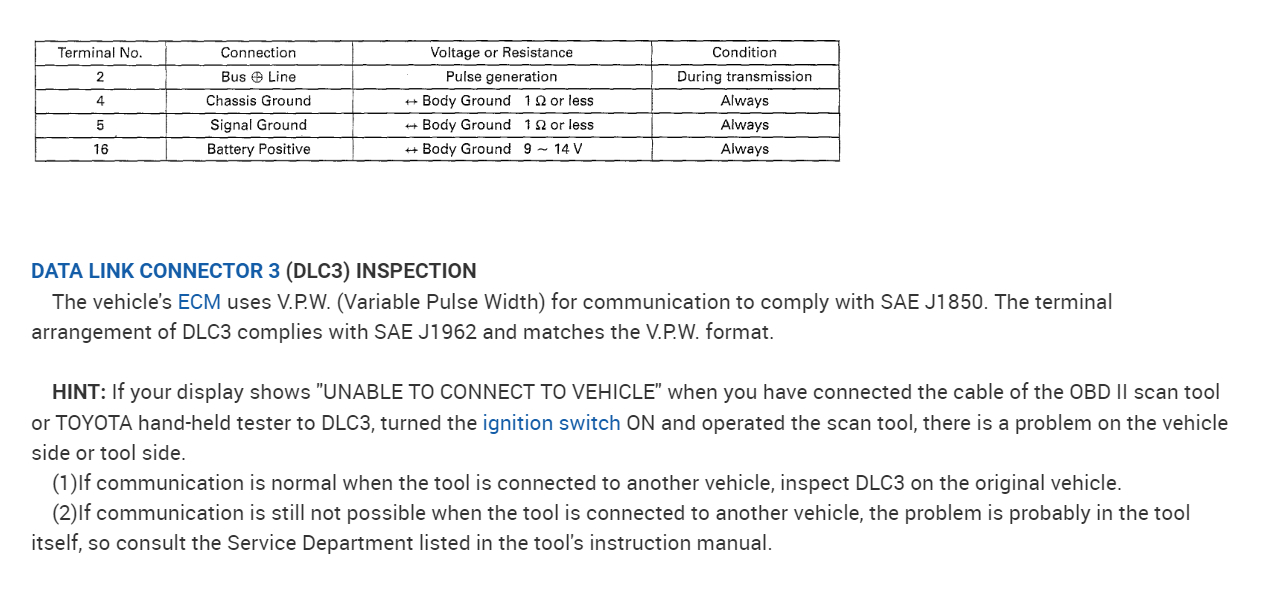 Here is what I was able to pull up on your vehicle's Data Link Connector (DLC). The DLC pins are standardized as per OBD2 regulations on every vehicle, so use the wiring diagram that I have included in the diagrams to see where the pins go to on the DLC. You will be looking for an open or for high resistance on one of the circuits. You will need to use a multi-meter to do this and I have included this link for you if you are unfamiliar with how to use one.