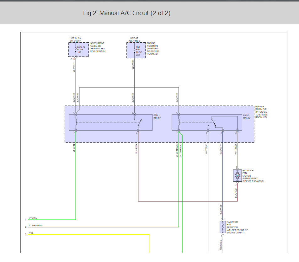 If you jumper the thing that is mounted in the high pressure line I can only assume is a pressure switch the cooling fan under the hood will come on, if you jumper it differently it will come on higher speed.