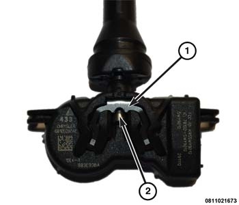 3. Install the sensor (1) onto the valve stem by aligning the rib in the sensor (2) to the valve stem.