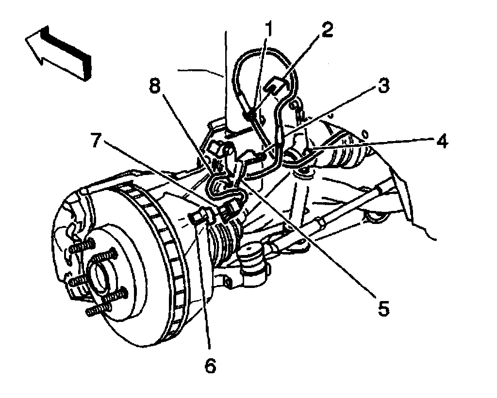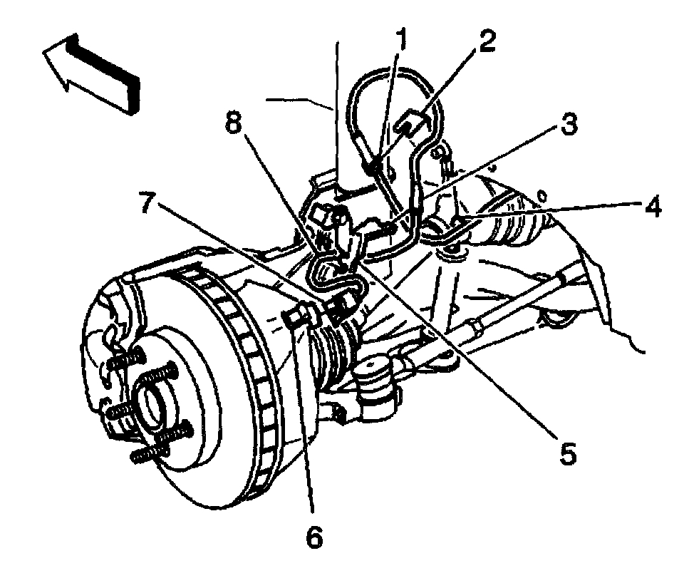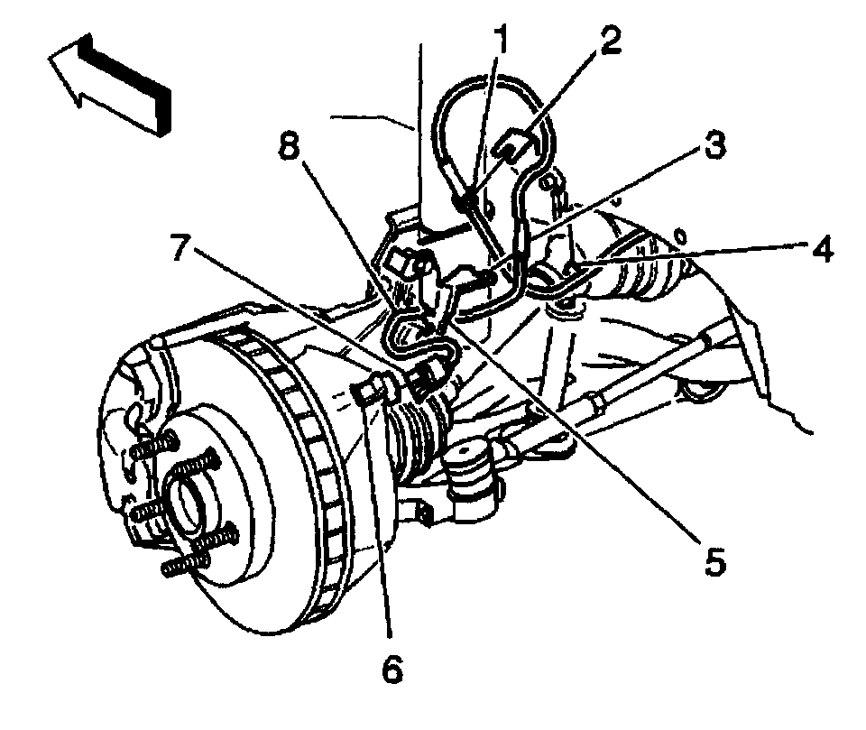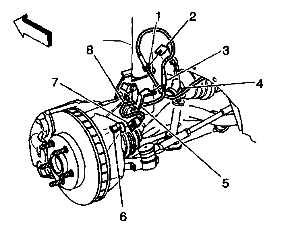 8. Route the wheel speed sensor wiring (8) through the top of the engine compartment.
