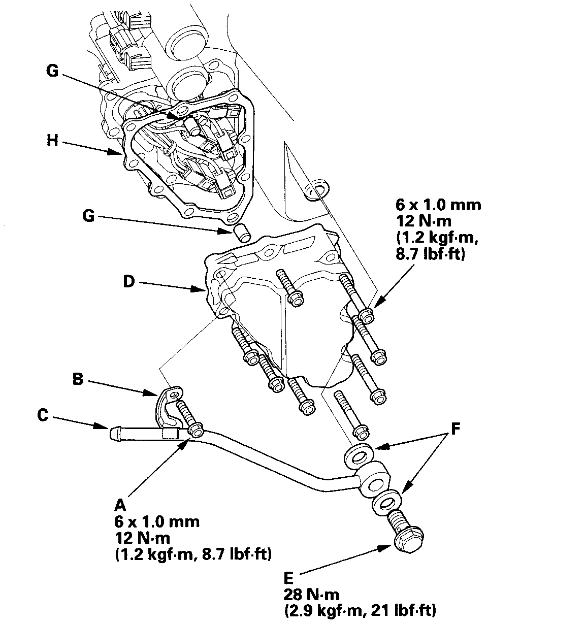 9. Remove the bolt (A) securing the bracket (B) of the ATF cooler inlet line (C) on the shift solenoid valve cover (D), and remove the line bolt (E) and sealing washers (F).