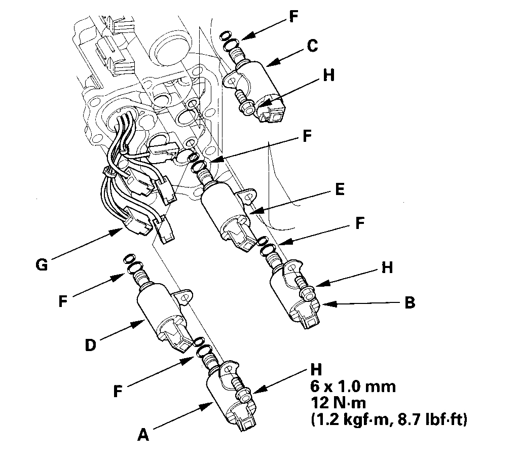 14. Install the shift solenoid valves A and B. While holding the shift solenoid valve body, be sure to install the solenoid valves until their mounting brackets contact the bracket of the installed solenoid. Install the solenoid mounting bolts (H) and tighten them.