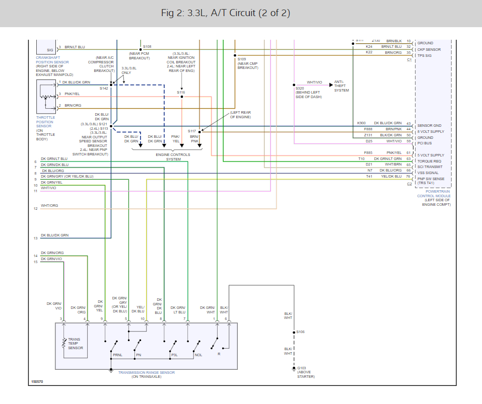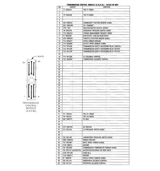 I did a transmission swap in my 2002 Chrysler Town and Country 3.3 engine. The replacement transmission came from a 1997 Dodge Grand Caravan 3.3 engine. I need to know the pinout diagram and color code for each wire on the transmission range sensor plug, on the Dodge. An also the pinout diagram and color code for wires on the Chrysler Town and Country plug that it connects to on the chassis.