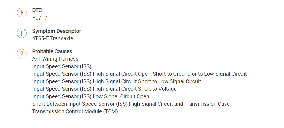 This G6 GTP 3.9 Transmission FR3 4T65E version has been registering ISS 717 code for almost 2 years with no symptoms that the driver could detect. The ISS was replaced but that didn't erase the code. Recently, the TCM was replaced and programmed: Still no change. This past week, the 49-Way connector and wires to the TCM were replaced by splicing. The code 717 was registered again. Finally- 2 days ago, the 20-Way external connector and wires to the transmission harness were replaced by splicing as well. When the job was done, everything was put back together except the Electronic Brake Module Connector was left unplugged *by mistake* as the car was being tested. Later on, the connector to the EBM was reconnected while the car was running and the scanner connected to the DLC *again, I think the engine should've been turned off while reconnecting the brake module.*  The scanner initially displayed a message: "Communication with the Body Control Module was Lost."  No code was registered. The car was taken for a drive cycle and the check engine light was actively cleared. Few minutes into the drive, the following occurred:
