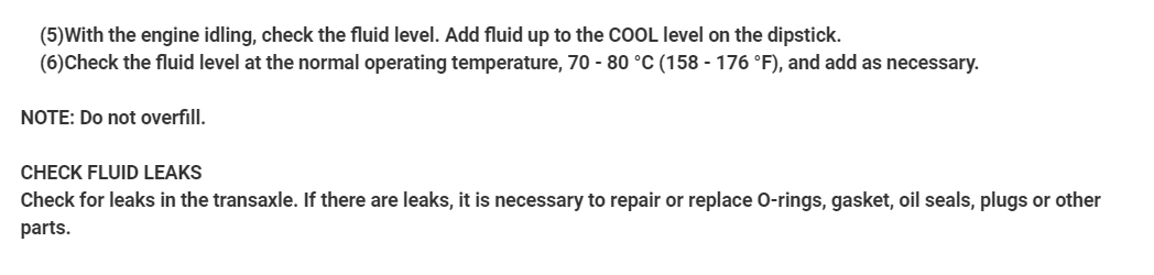 (6)Check the fluid level at the normal operating temperature, 70 - 80 °C (158 - 176 °F), and add as necessary.