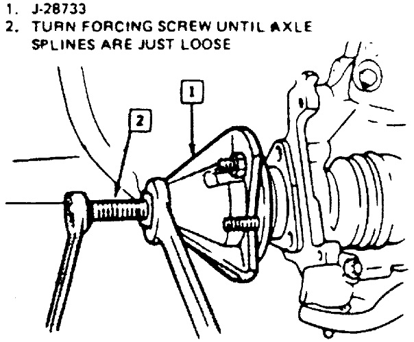 6. Remove drive axle from hub and bearing assembly using front hub spindle remover tool No. J-28733-A, or equivalent, Fig. 8 .