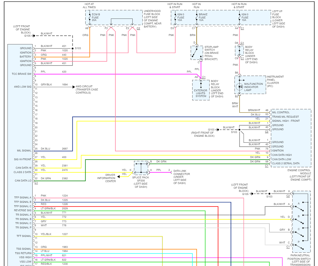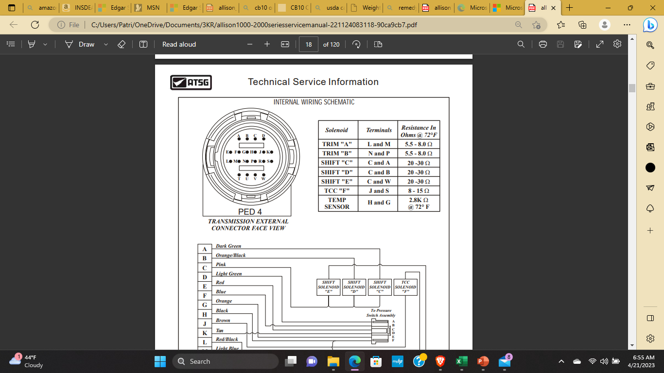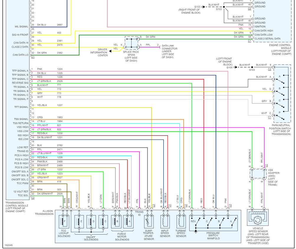 Transmission (Allison 1000) goes into limp mode or nothing. I thoroughly cleaned the valve body, load tested the internal harness and solenoids, checked OHMS, replaced the high-pressure shift valve, no burnt fluid. Codes indicate valve C, D, E, not working. I have been trying to load-test the harness and can't find a wire diagram that matches the harness. At the connector to the transmission position A is a pink wire, (diagram says should be dark green) at the TCM Red connector I have Position 1 pink as well, but my wire diagram from ATSG says it should be blue? Transmission and wires have never been touched by 1 owner. I will attach the diagram I am working from.