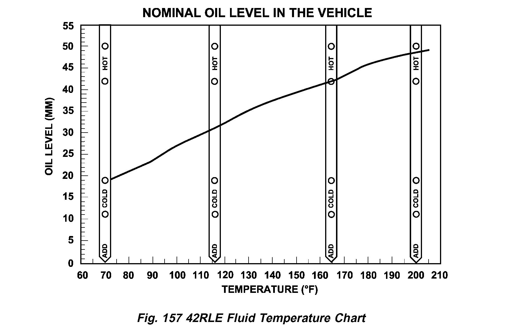 6. Adjust transmission fluid level shown on the dipstick according to the 42RLE Fluid Temperature Chart (Fig. 157). Use only Mopar (R) ATF + 4, Automatic Transmission Fluid.