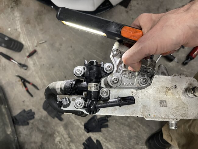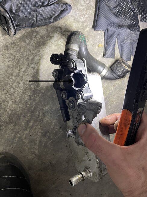 This is a 2019 430i, RWD, didn't find the option for it so I have chosen 428, anyways, whenever I filled the expansion tank water was seeping from below, saw where something was broken on top of the transmission oil cooler, but couldn't see exactly what it is. I removed it but I don't see where this top black part connects to. It may be a transmission oil cooler thermostat that broke off of its place and connects to nothing, but I want to make sure. The bottom 2 connectors go to the transmission line and to the transmission, a side connector goes to a coolant hose on the bottom, but the top one that has broken off I see new ones have a clip inside it with a thermostat, but I don't see where it connects anywhere. Shouldn't there be a return line for the coolant? I marked it with an arrow.
